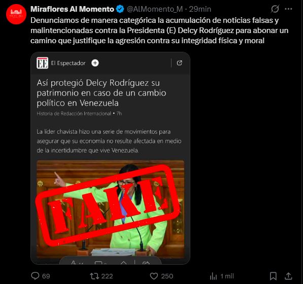 En el post, la cuenta oficial compartió una captura de una publicación de El Espectador titulada “Así protegió Delcy Rodríguez su patrimonio político en caso de un cambio en Venezuela”, acompañada de una imagen de la líder chavista en un discurso (marcada con un gran sello rojo FAKE).