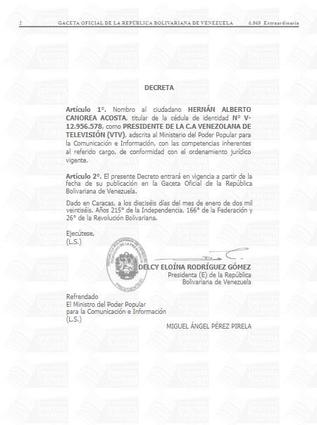 Delcy Rodríguez continúa ejecutando cambios en posiciones clave en la estructura chavista. Ahora, según el decreto N.º 5.216, publicado en la Gaceta Oficial N.º 6.969, el periodista Hernán Canorea ha sido designado como el nuevo presidente del canal complaciente del régimen Venezolana de Televisión (VTV).