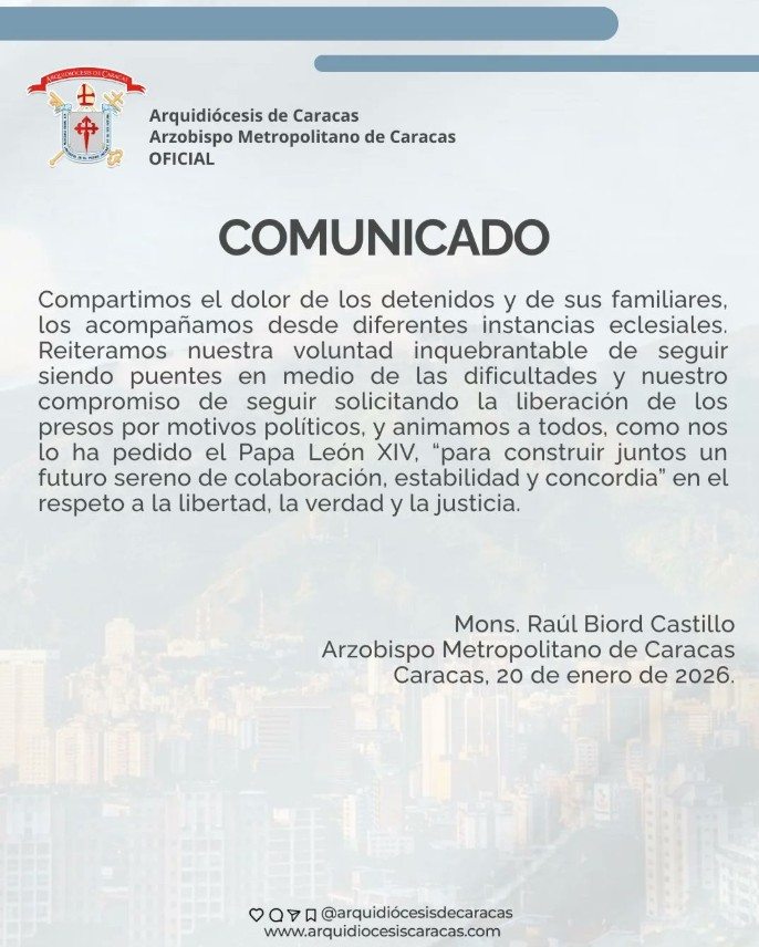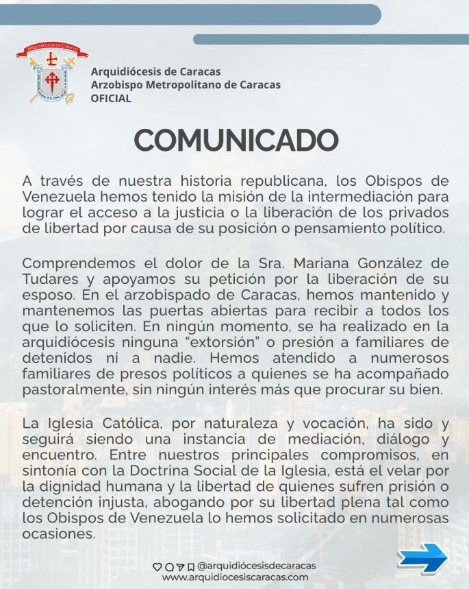 «En ningún momento se ha realizado en la arquidiócesis ninguna ‘extorsión’ o presión a familiares de detenidos ni a nadie», se lee en un comunicado firmado por el arzobispo metropolitano de Caracas, monseñor Raúl Biord, y publicado en la red social Instagram.