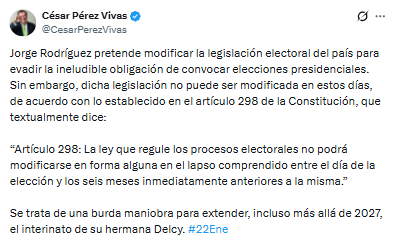 El exgobernador del estado Táchira, César Pérez Vivas, denunció este jueves 22 de enero que las pretensiones de Jorge Rodríguez de modificar la legislación electoral representan una violación directa a la Constitución Nacional.