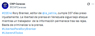 El Colegio Nacional de Periodistas (CNP) denunció la situación de Rory Branker, editor del medio digital La Patilla, quien cumple este 22 de enero 337 días privado de su libertad.