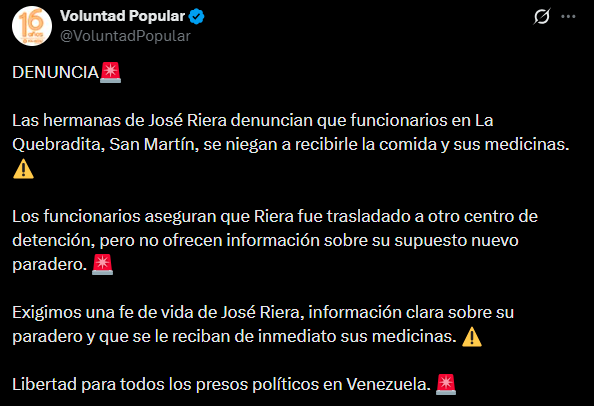 A través de un mensaje publicado en su cuenta oficial de X (antes Twitter), Voluntad Popular alertó que los custodios responsables del centro de detención, rechazaron las donaciones de alimentos y los medicamentos necesarios para garantizar la salud de Riera.