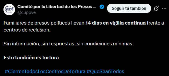 En su publicación en X, Clippve subrayó la falta de transparencia del proceso y la ausencia de información oficial para las familias que, desesperadas, no han recibido respuestas ni fechas sobre cuándo verán a sus seres queridos recobrar su libertad.