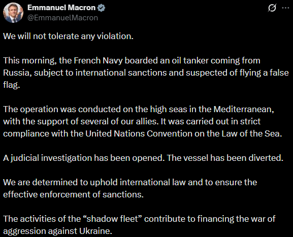 «No dejaremos que nada quede impune. La Marina francesa abordó esta mañana un petrolero procedente de Rusia, sometido a sanciones internacionales y sospechoso de navegar bajo bandera falsa», informó el jefe de Estado francés.