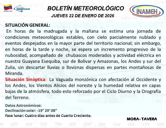 El Instituto Nacional de Meteorología e Hidrología (Inameh) informó que para este jueves 22 de enero prevalecerán condiciones meteorológicas estables durante las primeras horas del día, con un incremento de la inestabilidad hacia la tarde y noche en diversas zonas del país.