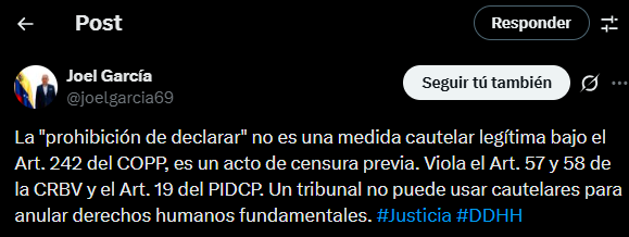 Joel García cuestionó duramente esta última restricción: “La ‘prohibición de declarar’ no es una medida cautelar legítima bajo el Art. 242 del COPP, es un acto de censura previa. Viola el Art. 57 y 58 de la CRBV y el Art. 19 del PIDCP. Un tribunal no puede usar cautelares para anular derechos humanos fundamentales. #Justicia #DDHH”.