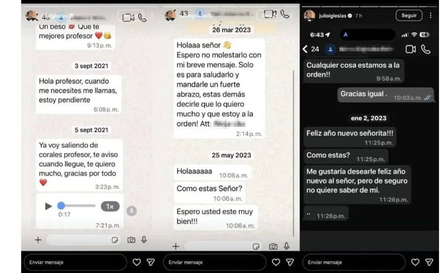 En este contexto, Iglesias ha insistido en el comunicado de ‘Instagram’ que «todo tiene un límite». «Es necesario desenmascarar estas falsedades y contar la verdad», ha reiterado. Finalmente, el cantante ha explicado que adjunta «algunas de las conversaciones» de ‘WhatsApp’ «que ponen de manifiesto la incoherencia de las denuncias y la manipulación mediática» a la que, según ha dicho, está siendo sometido. En concreto, ha publicado varios ‘pantallazos’ con supuestos mensajes de sus exempleadas, fechados en los años 2021, 2022 y 2023.