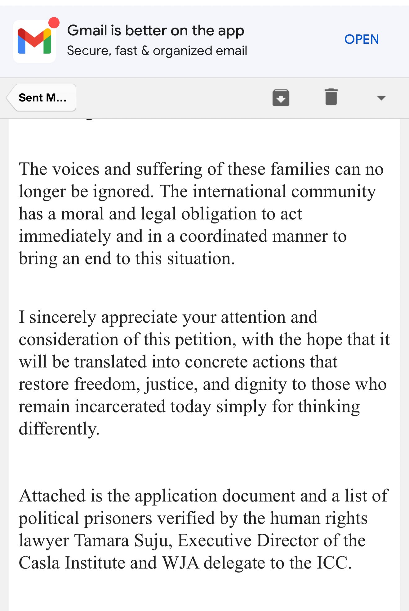 En el mensaje también se informó que fue adjuntado un documento formal con la propuesta de creación de la comisión, así como una primera lista de presos políticos, la cual habría sido verificada por la abogada y defensora de derechos humanos Tamara Suju, directora ejecutiva del Casla Institute y delegada de la World Jurist Association (WJA) ante la CPI.