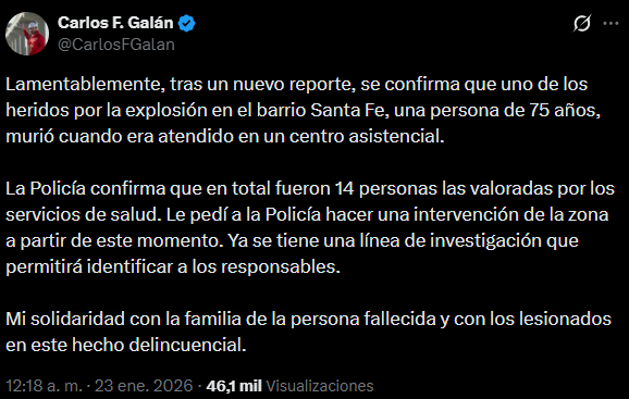 «Lamentablemente, tras un nuevo reporte, se confirma que uno de los heridos por la explosión en el barrio Santa Fe, una persona de 75 años, murió cuando era atendido en un centro asistencial», manifestó en su cuneta de X el alcalde Bogotá, Carlos Fernando Galán.
