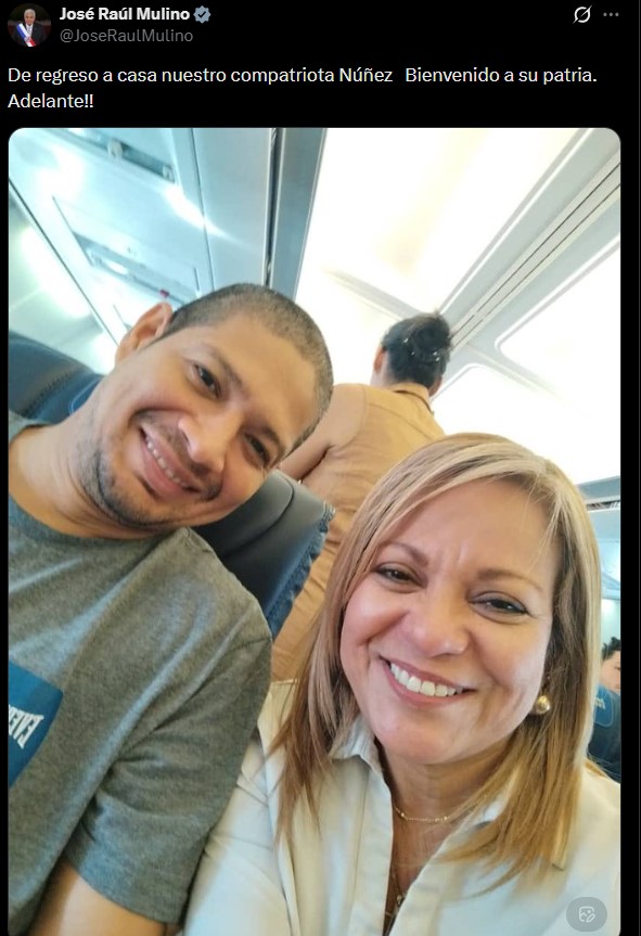 «De regreso a casa nuestro compatriota Núñez. Bienvenido a su patria. Adelante!!», escribió el jefe de Estado en su cuenta de X, en un mensaje acompañado del liberado en lo que parece una cabina de avión.
