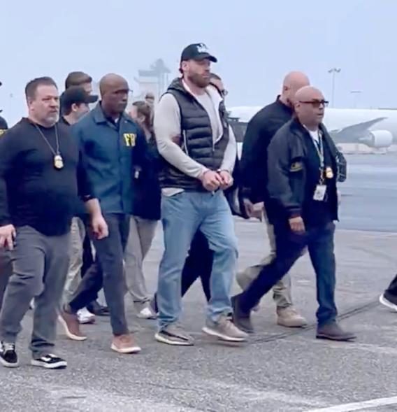 Wedding llevaba vaqueros, un chaleco negro y una gorra de Los Ángeles y mantuvo la cabeza gacha mientras las autoridades federales lo escoltaban por la pista.