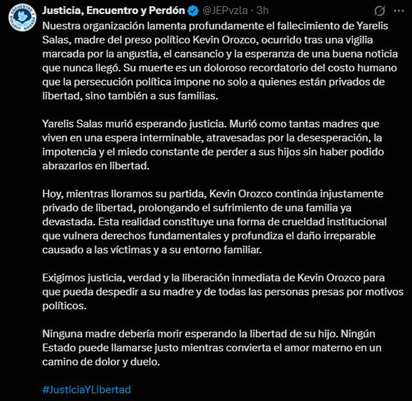 A través de un mensaje publicado en su cuenta oficial de X (antes Twitter), la organización lamentó profundamente la muerte de Salas y advirtió que su caso evidencia el alto costo humano de la persecución política en Venezuela, que no solo afecta a quienes permanecen privados de libertad, sino también a sus familiares.