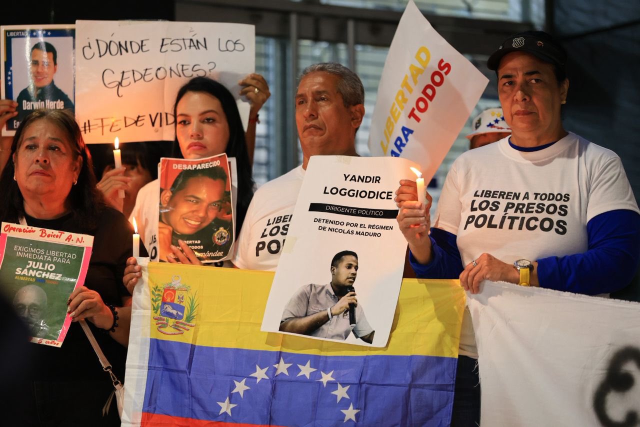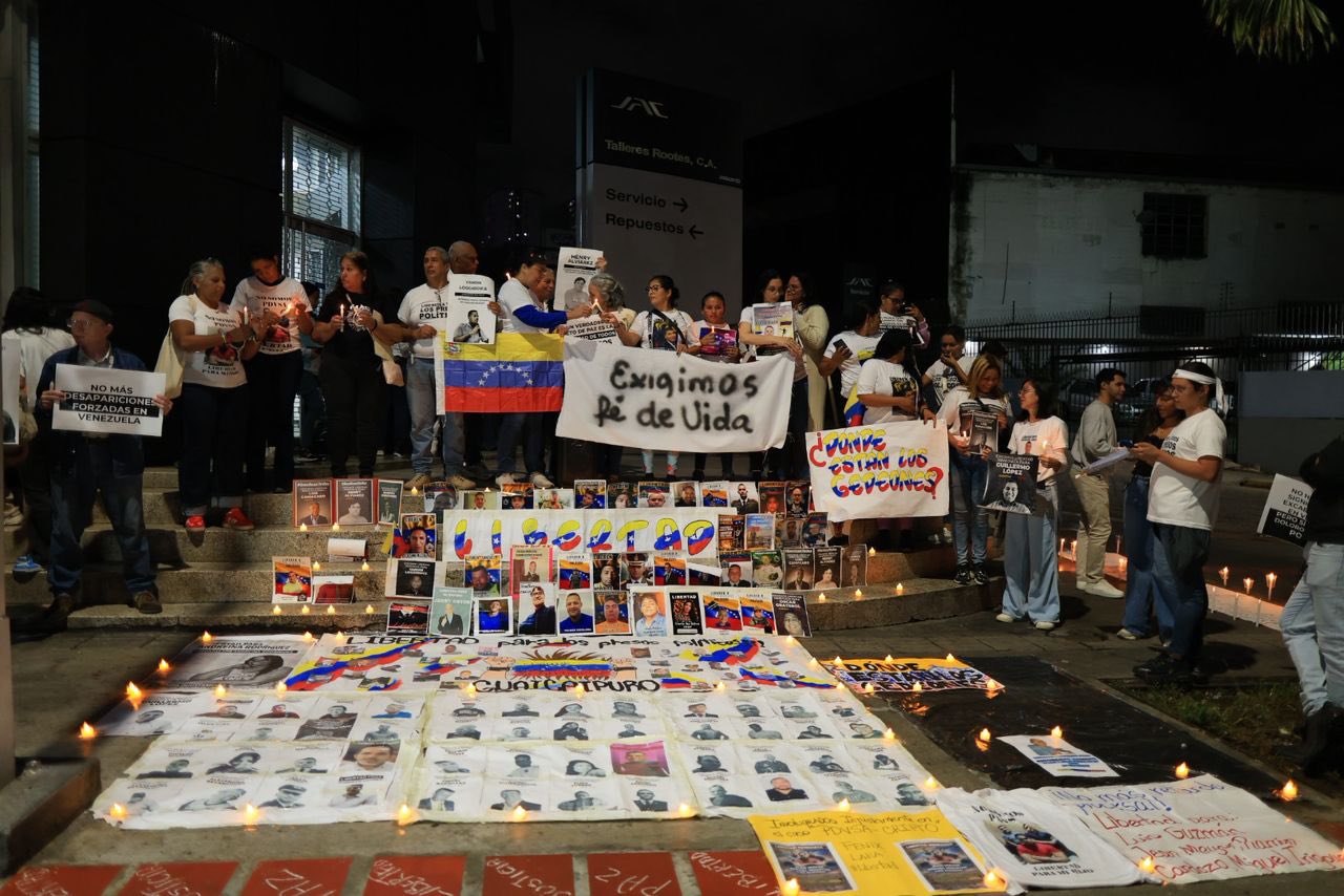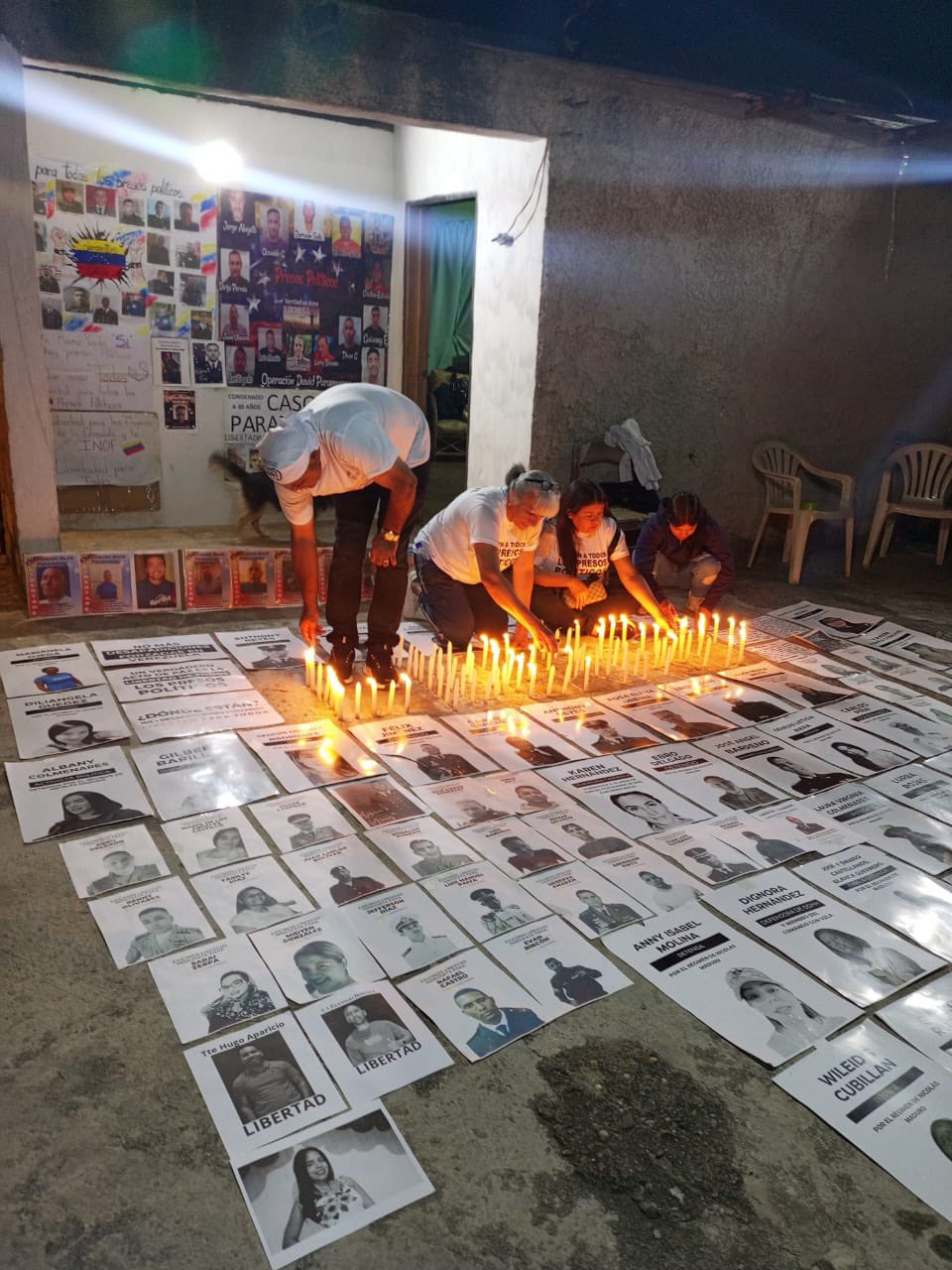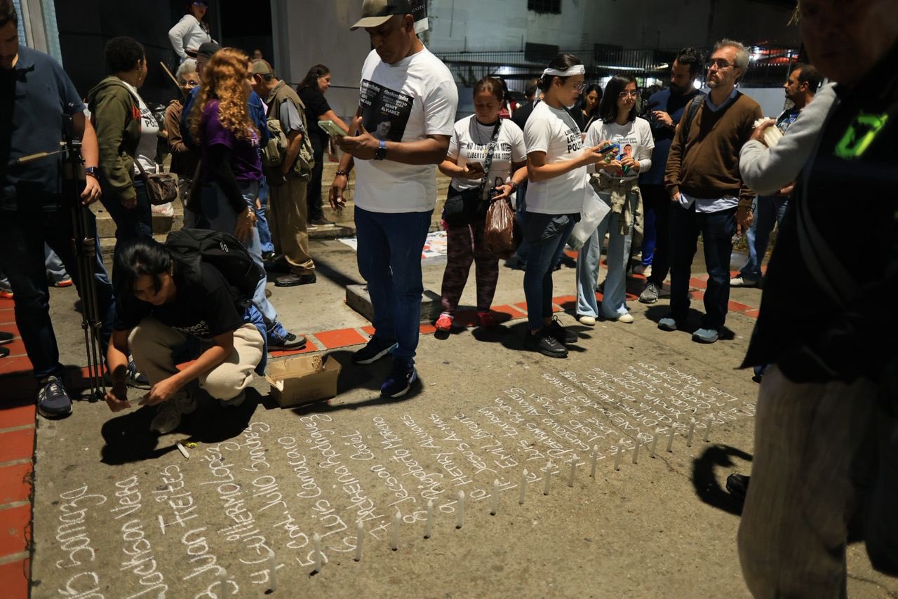 En la décima sexta jornada consecutiva de vigilia por la liberación de los presos políticos en Venezuela, familiares de los detenidos implementaron un nuevo y emotivo método de protesta: escribir con tiza en las calles los nombres de sus seres queridos recluidos arbitrariamente, acompañados de imágenes con sus rostros, y velas encendidas que iluminaron la oscuridad.