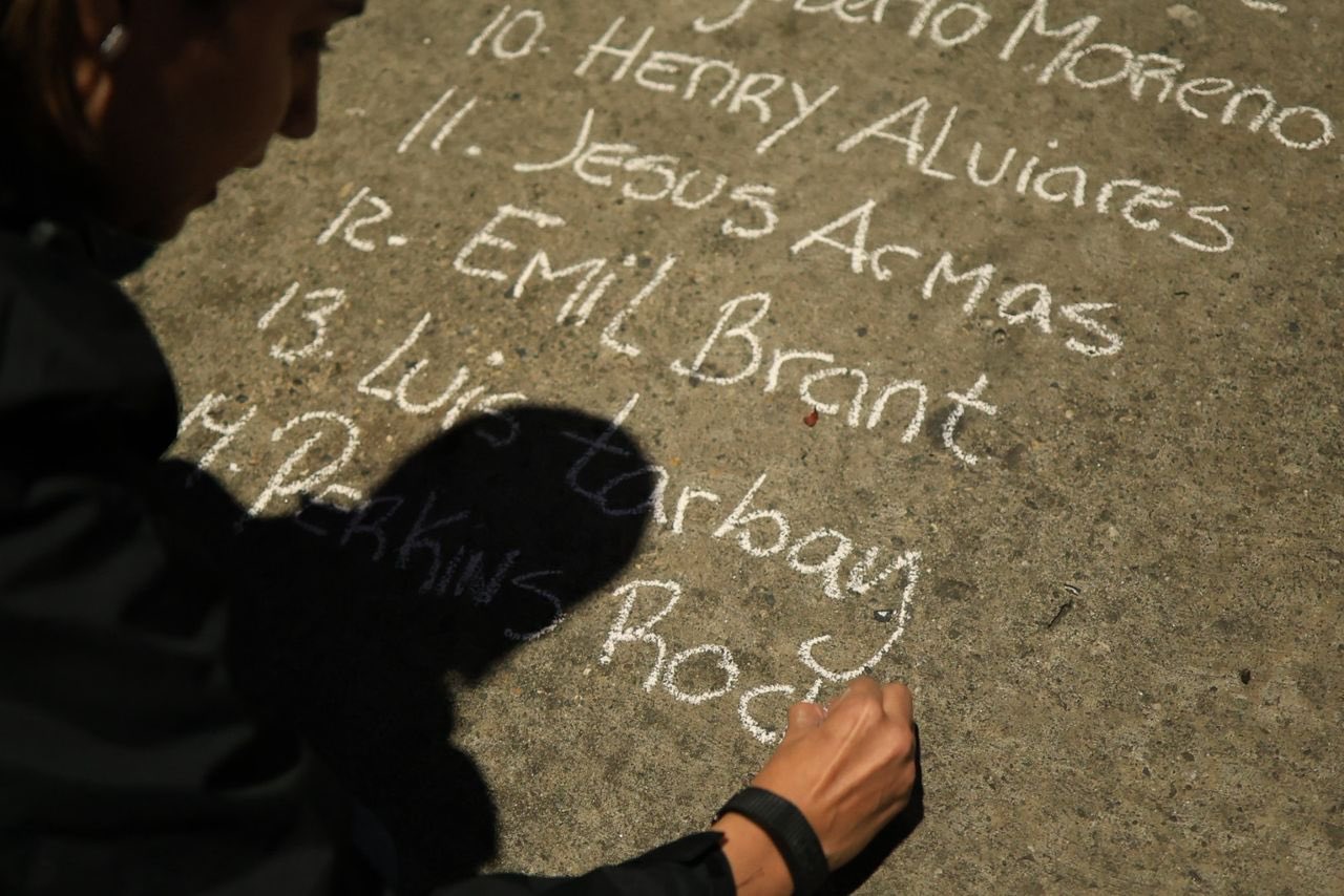 Los participantes trazaron en el pavimento listas de nombres como Josnar Baduel, Freddy, Superlano, Javier Londoño, Morillo, Jesús Darío, entre muchos otros, simbolizando cada uno una demanda individual de libertad.