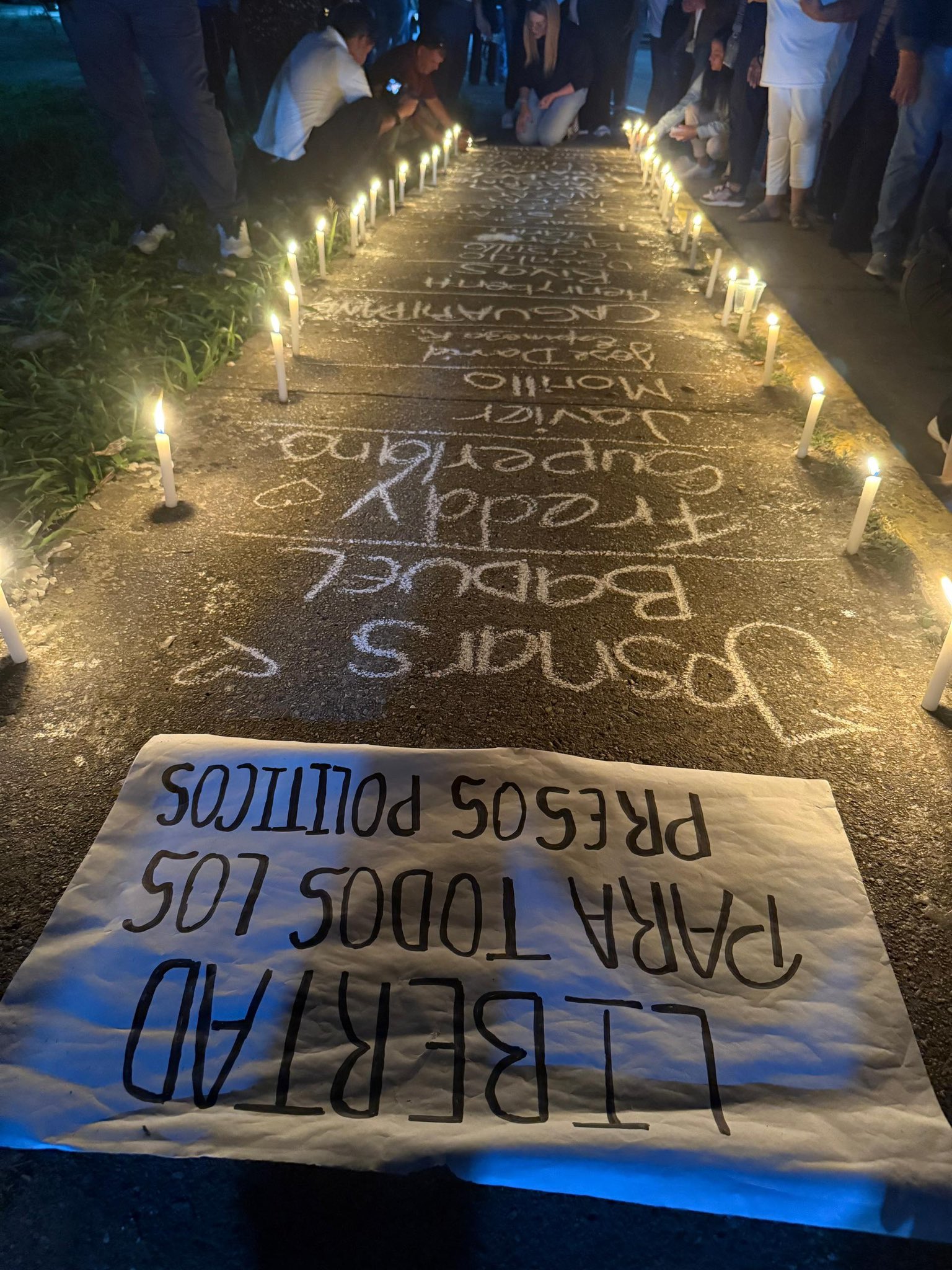 El acto, cargado de simbolismo, incluyó velas colocadas junto a cada nombre, creando pasillos de luz que representaban esperanza y resistencia pacífica. Familiares se arrodillaron para escribir y encender las velas, mientras otros sostenían carteles con mensajes como «Libertad para todos los presos políticos», además de consignas colectivas que exigían «Que sean todos».