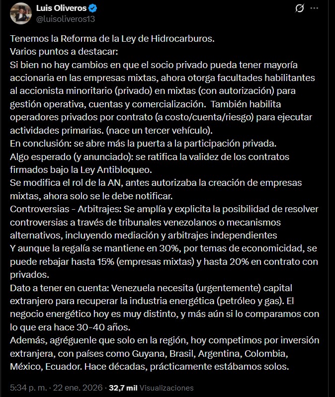 El economista venezolano Luis Oliveros ofreció este jueves un análisis detallado sobre la Reforma de la Ley de Hidrocarburos aprobada recientemente por el Parlamento Legislativo, controlado por el chavismo, con el objetivo de atraer inversión privada y extranjera al sector energético del país tras la captura de Nicolás Maduro.