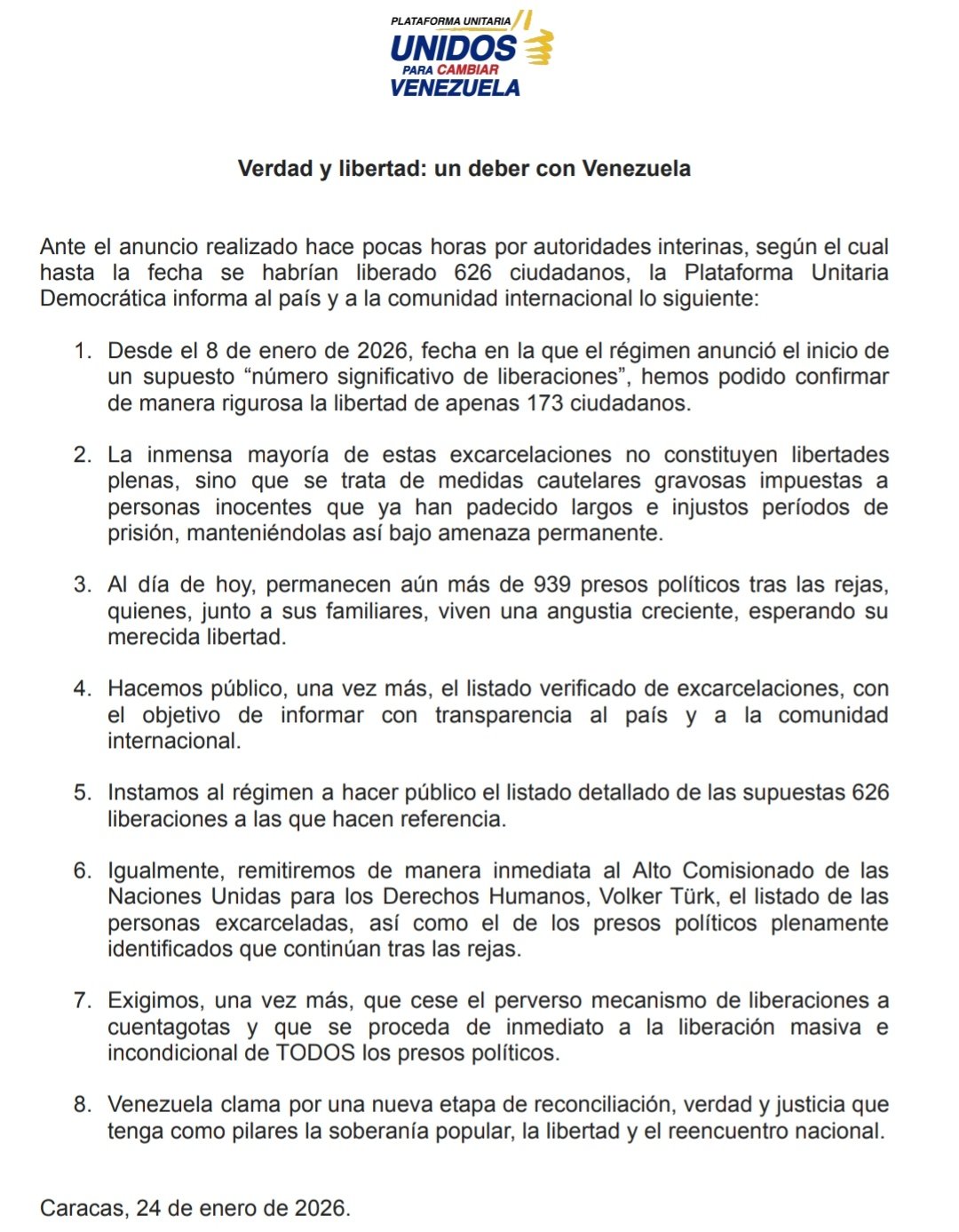 La Plataforma Unitaria emitió un comunicado este sábado donde le exige al chavismo que de una lista detallada de los 626 presos políticos excarcelados en Venezuela, que aseguran haber liberado, pese a que no se tiene información del caso.