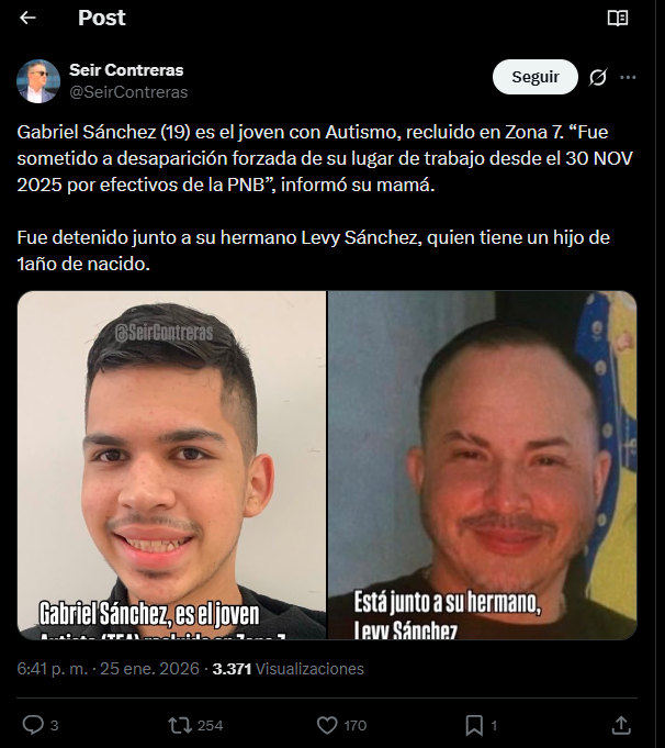 Familiares y defensores de derechos humanos elevaron una alerta por la desaparición forzada y detención arbitraria de Gabriel Ángel Sánchez Piña, un joven de 19 años con Trastorno del Espectro Autista (TEA), quien se encuentra recluido desde el 30 de noviembre de 2025 en la Zona 7 de la Policía Nacional Bolivariana (PNB) en Boleíta, Caracas, según informó su madre a través de redes sociales y fuentes periodísticas.