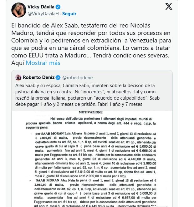 «El bandido de Alex Saab, testaferro del reo Nicolás Maduro, tendrá que responder por todos sus procesos en Colombia y lo pediremos en extradición a Venezuela para que se pudra en una cárcel colombiana», escribió Dávila en su cuenta de X.