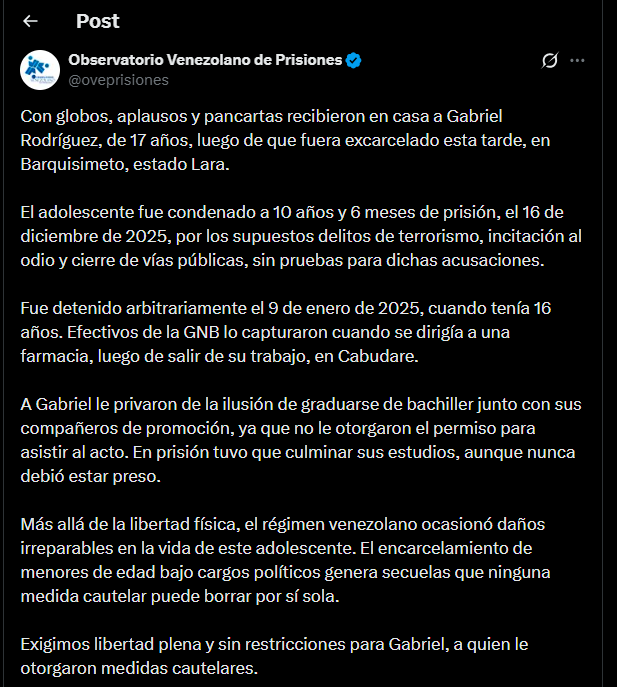Con globos, aplausos y pancartas, la familia de Gabriel Rodríguez, adolescente de 17 años, celebró su libertad tras ser excarcelado este lunes 26 de enero en Barquisimeto, estado Lara, informó el Observatorio Venezolano de Prisiones (OVP) en su cuenta oficial de X.