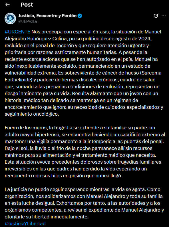 A través de un mensaje publicado en su cuenta oficial de X (antes Twitter), la organización expresó su profunda preocupación debido a que Bohórquez Colina fue excluido de las recientes excarcelaciones autorizadas en el país, pese a encontrarse en un estado de extrema vulnerabilidad.