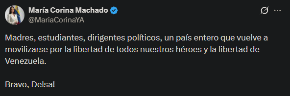 “Madres, estudiantes, dirigentes políticos, un país entero que vuelve a movilizarse por la libertad de todos nuestros héroes y la libertad de Venezuela. Bravo, Delsa”, escribió Machado en su cuenta de X, en respuesta a un mensaje difundido por Encuentro Ciudadano sobre la reaparición pública de Solórzano.