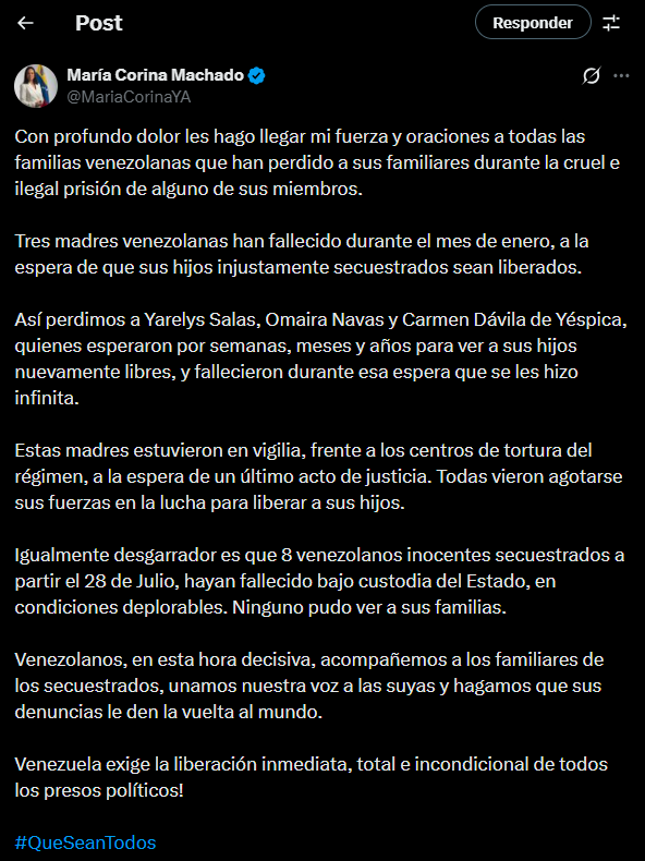 “El dolor que sentimos hoy es el dolor de toda Venezuela. Estas familias no sólo perdieron a sus seres queridos, sino que vieron desvanecerse su esperanza ante un sistema que persiste en la injusticia y la represión”, afirmó Machado en su mensaje, en el que hizo un **llamado urgente a la comunidad internacional a amplificar las denuncias y exigir la liberación total de todos los presos políticos en el país”.