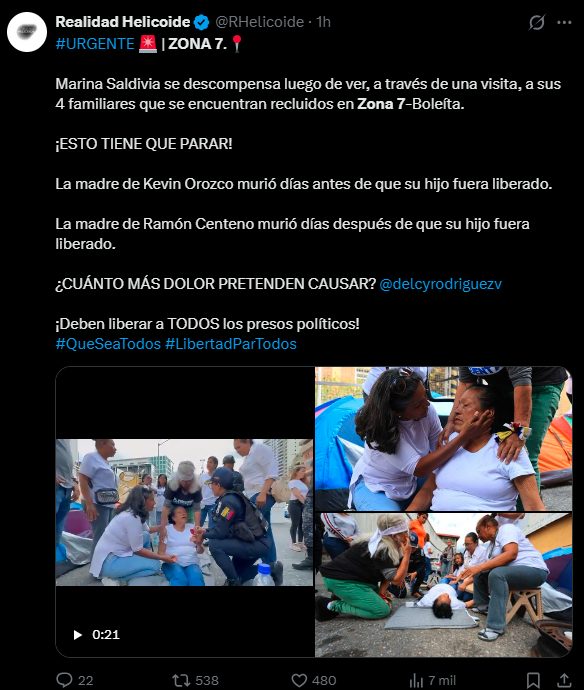 Una mujer se descompensó la tarde de este martes 27 de enero, luego de haber podido ver, a través de una visita, a varios de sus familiares que permanecen recluidos de forma arbitraria en la Zona 7 de Boleíta, en Caracas.