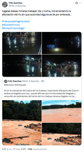 El periodista Fritz Sánchez denunció a través de su cuenta en X que, a pesar de ser cuerpos de agua protegidos por Ley, la alteración del cauce confirma que la actividad extractiva no ha disminuido.