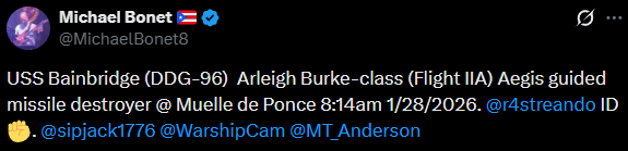 El destructor de misiles guiados USS Bainbridge (DDG-96) arribó en la mañana del pasado miércoles al muelle de Ponce, al sur de Puerto Rico, donde recibirá reabastecimiento.