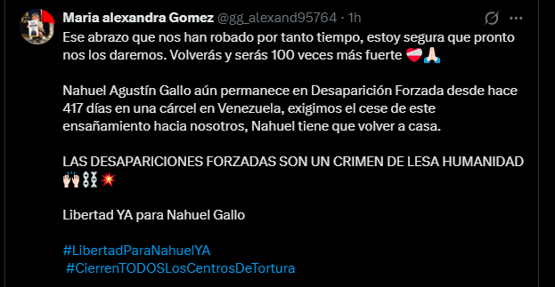 «Nahuel Agustín Gallo aún permanece en Desaparición Forzada desde hace 417 días en una cárcel en Venezuela, exigimos el cese de este ensañamiento hacia nosotros, Nahuel tiene que volver a casa. LAS DESAPARICIONES FORZADAS SON UN CRIMEN DE LESA HUMANIDAD ? Libertad YA para Nahuel Gallo #LibertadParaNahuelYA #CierrenTODOSLosCentrosDeTortura», manifestó.