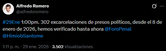 El director presidente de la organización, Alfredo Romero, informó en una publicación de su cuenta de X que «302 excarcelaciones de presos políticos, desde el 8 de enero de 2026, hemos verificado hasta ahora».