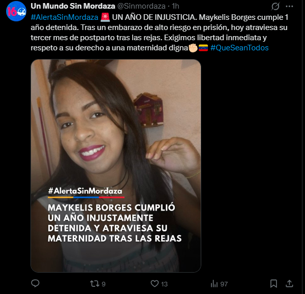 La publicación de la organización defensora de DDHH resume la crudeza del caso con un mensaje contundente: “UN AÑO DE INJUSTICIA. Maykelis Borges cumple 1 año detenida. Tras un embarazo de alto riesgo en prisión, hoy atraviesa su tercer mes de postparto tras las rejas. Exigimos libertad inmediata y respeto a su derecho a una maternidad digna”.