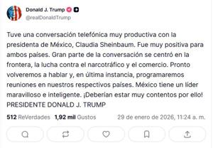 Trump aseguró que «México tiene una líder maravillosa y muy inteligente. ¡Deberían estar muy contentos con eso!», dijo el mandatario en un mensaje en su red Truth Social tras asegurar que volverán a conversar pronto.