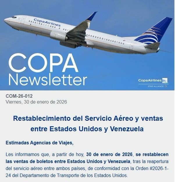 La aerolínea panameña Copa Airlines anunció este viernes la reanudación de la venta de boletos entre Estados Unidos y Venezuela, tras la reapertura del servicio aéreo entre ambos países