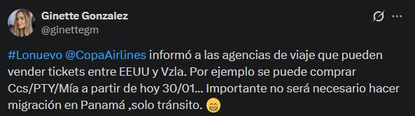 Laa periodista Ginette González precisó en su cuenta de X, que los boletos se pueden comprar con escala en Panamá, y que no será necesario realizar migración en ese país centroamericano, sino únicamente tránsito, lo que simplifica el viaje para los pasajeros entre Estados Unidos y Venezuela.
