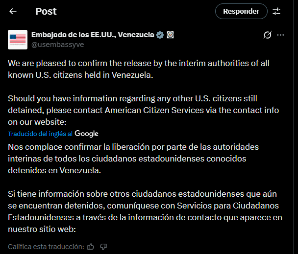 «Nos complace confirmar la liberación, por parte de las autoridades interinas, de todos los ciudadanos estadounidenses de los que se tenía conocimiento que se encontraban detenidos en Venezuela», asegura la Oficina Externa de EEUU para Venezuela, que opera en Bogotá desde que ambos países cerraron sus embajadas en Washington y Caracas en 2019 al romper relaciones diplomáticas.