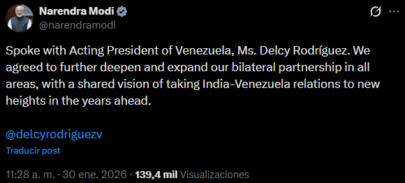 Este es el primer contacto oficial entre Modi y Rodríguez desde que esta tomó el Palacio de Miraflores, y ocurre un día después de que el chavismo aprobara por unanimidad la reforma de la Ley Orgánica de Hidrocarburos.
