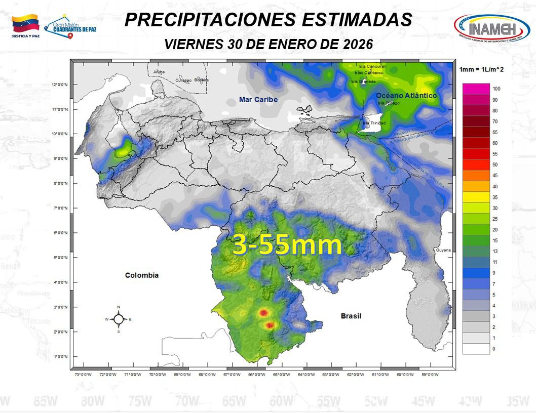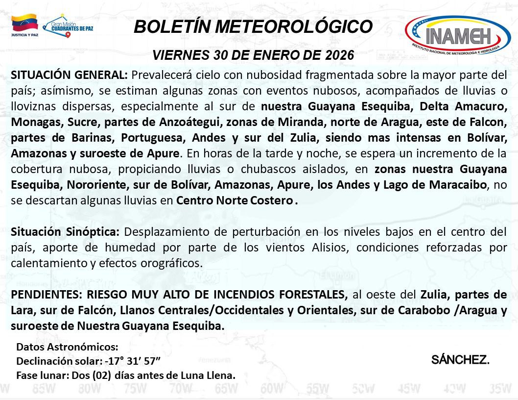 El Instituto Nacional de Meteorología e Hidrología (Inameh) informó este viernes 30 de enero que la estabilidad atmosférica se verá interrumpida por la prevalencia de nubosidad fragmentada en la mayor parte del territorio nacional.
