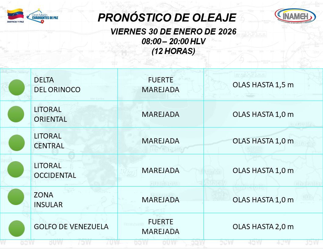 Respecto a las costas venezolanas, el Inameh reportó las siguientes condiciones de oleaje:
