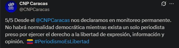 El CNP Caracas subrayó que la excarcelación por sí sola es «insuficiente» y exigió el «sobreseimiento total de las causas, el cierre definitivo de los expedientes judiciales y la anulación de antecedentes penales impuestos» por el ejercicio del periodismo. “No basta con salir de prisión si se mantiene la amenaza judicial”, advirtió.
