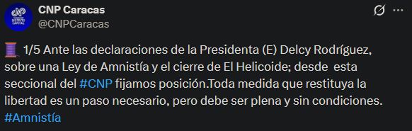 A través de un comunicado compartido en su cuenta de X, el gremio consideró que el anuncio representa un reconocimiento implícito de la persecución y de las detenciones arbitrarias, por lo que celebró cualquier medida que devuelva la libertad a periodistas y trabajadores de la prensa, siempre que sea sin condicionamientos políticos o judiciales.