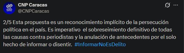 El CNP insistió en que la libertad de expresión debe ser el eje de cualquier medida de reconciliación, lo que implica el «levantamiento de restricciones a medios digitales, el fin del uso discrecional de controles oficiales sobre frecuencias radioeléctricas y garantías plenas para el libre ejercicio del periodismo».