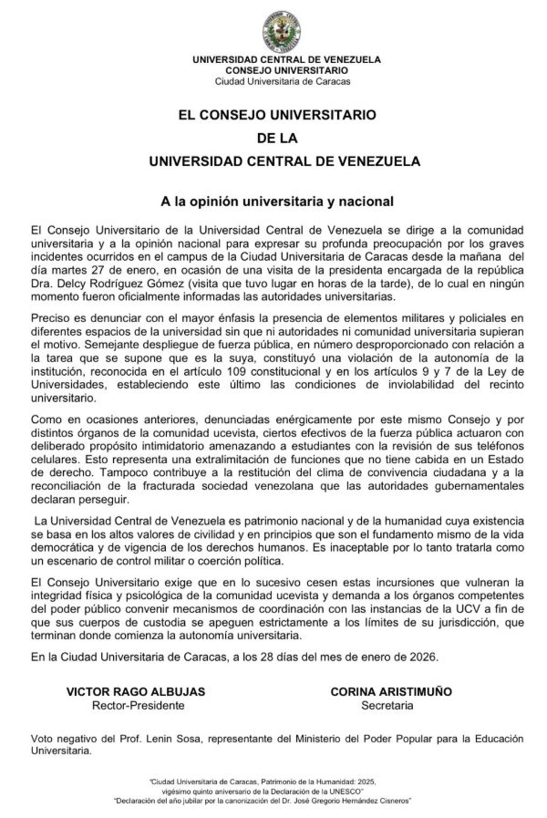 Consejo Universitario de la Universidad Central de Venezuela (UCV) denunció en un comunicado firmado el pasado miércoles la intromisión no autorizada de Delcy Rodríguez y sus uniformados dentro de la casa de estudios.