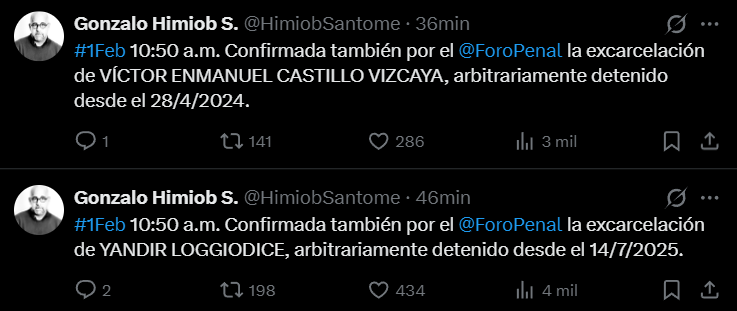La ONG Foro Penal confirmó este domingo la excarcelación del agricultor Víctor Castillo y el profesor universitario Yandir Loggiodice, quienes sufrieron injusticias en El Helicoide, sede en Caracas del Servicio Bolivariano de Inteligencia Nacional (Sebin).
