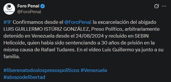 «Confirmamos desde el Foro Penal la excarcelación del abogado LUIS GUILLERMO ISTÚRIZ GONZÁLEZ, preso político, arbitrariamente detenido en Venezuela desde el 24/08/2024 y recluido en SEBIN Helicoide, quien había sido sentenciado a 30 años de prisión en la misma causa de Rafael Tudares», escribió.