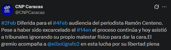 El CNP destacó que, pese a presentar malestar físico, Centeno acudió a los tribunales para cumplir con el proceso. Asimismo, reiteró que acompañará al periodista en su lucha por alcanzar la libertad plena.