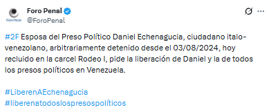 La declaración de la esposa de Echenagucia surge tras las recientes excarcelaciones que han devuelto la alegría a algunas familias venezolanas.