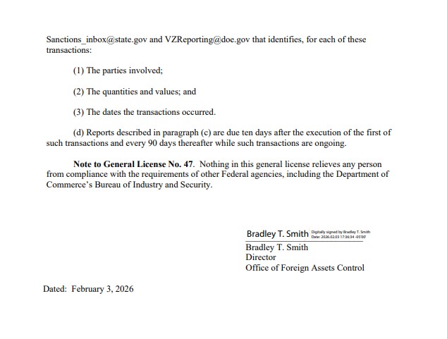 La autorización, que es la segunda licencia general que Washington otorga hasta el momento para aliviar las sanciones a Venezuela tras la captura de Nicolás Maduro por parte de Estados Unidos el mes pasado, respalda la política de la administración de recuperar el sector petrolero de Venezuela, dice el documento.