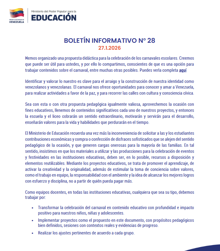 La instrucción fue difundida a través del Boletín Informativo N° 28, fechado el 27 de enero, donde se establecieron los lineamientos para las festividades en los planteles. En el documento, la cartera educativa enfatizó la necesidad de desarrollar propuestas que aprovecharan los recursos disponibles en las instituciones y elementos reutilizables, priorizando el aprendizaje sobre el consumo.